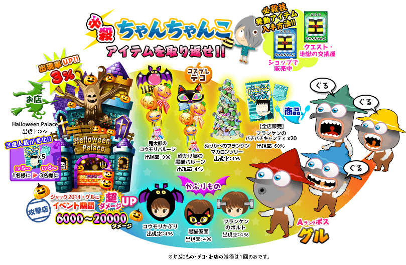 公式 ゲゲゲの鬼太郎 妖怪横丁 ちゃんちゃんこで攻撃して ハロウィンアイテムを奪い返そう グルからは フランケンを必ずまねく商品 鬼太郎 砂かけ婆 ぬりかべのハロウィンコスプレデコ かぶりもの 攻撃店などを奪ってくるぞ
